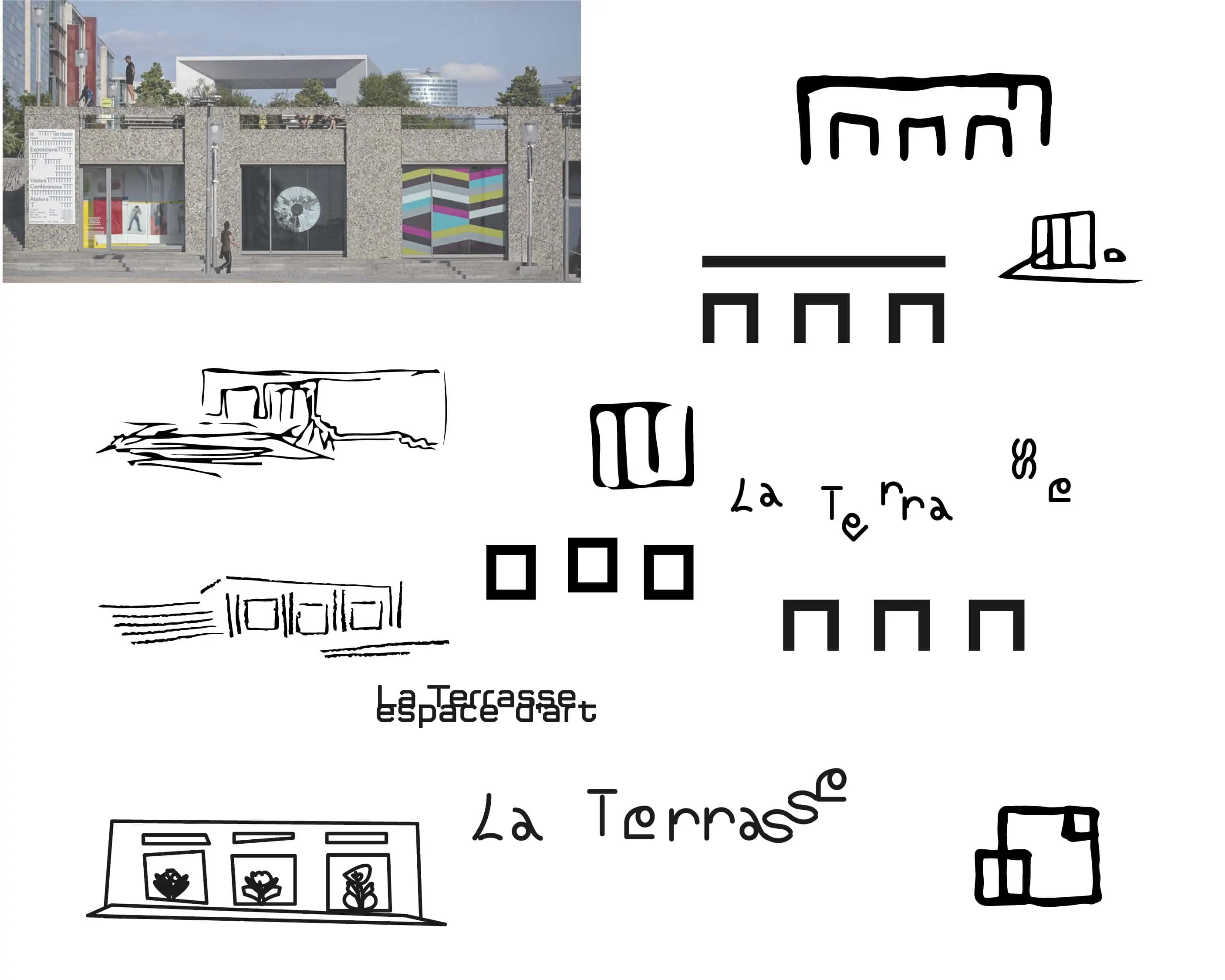 De nombreux éléments lié à l'architecture de La Terrasse sont composés en trilogie : il y a trois espaces d'exposition, la façade principale est divisée