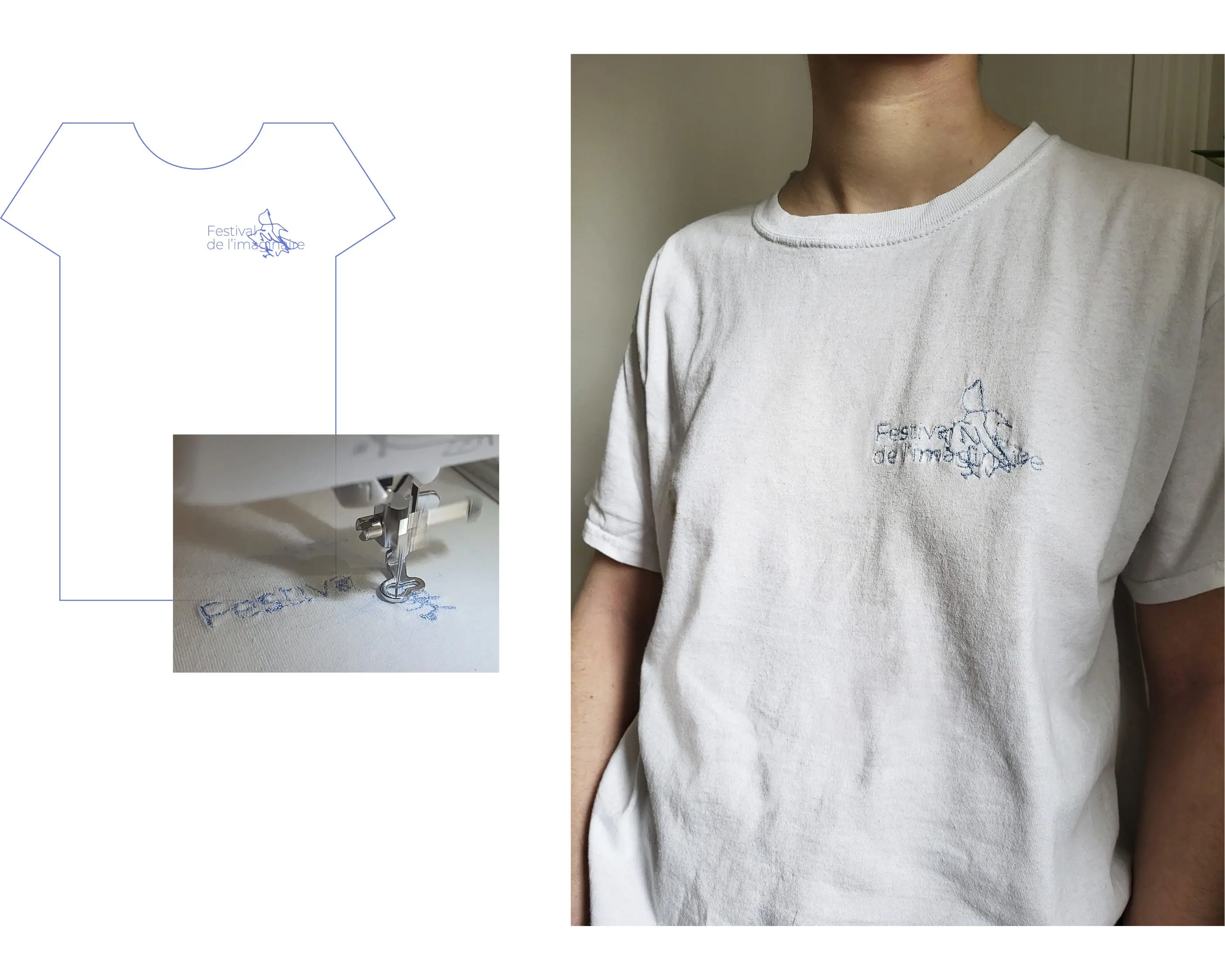 Pour le T-shirt du festival, le logo est simplement brodé sur la poitrine : il suscite l'identification tout en restant discret.