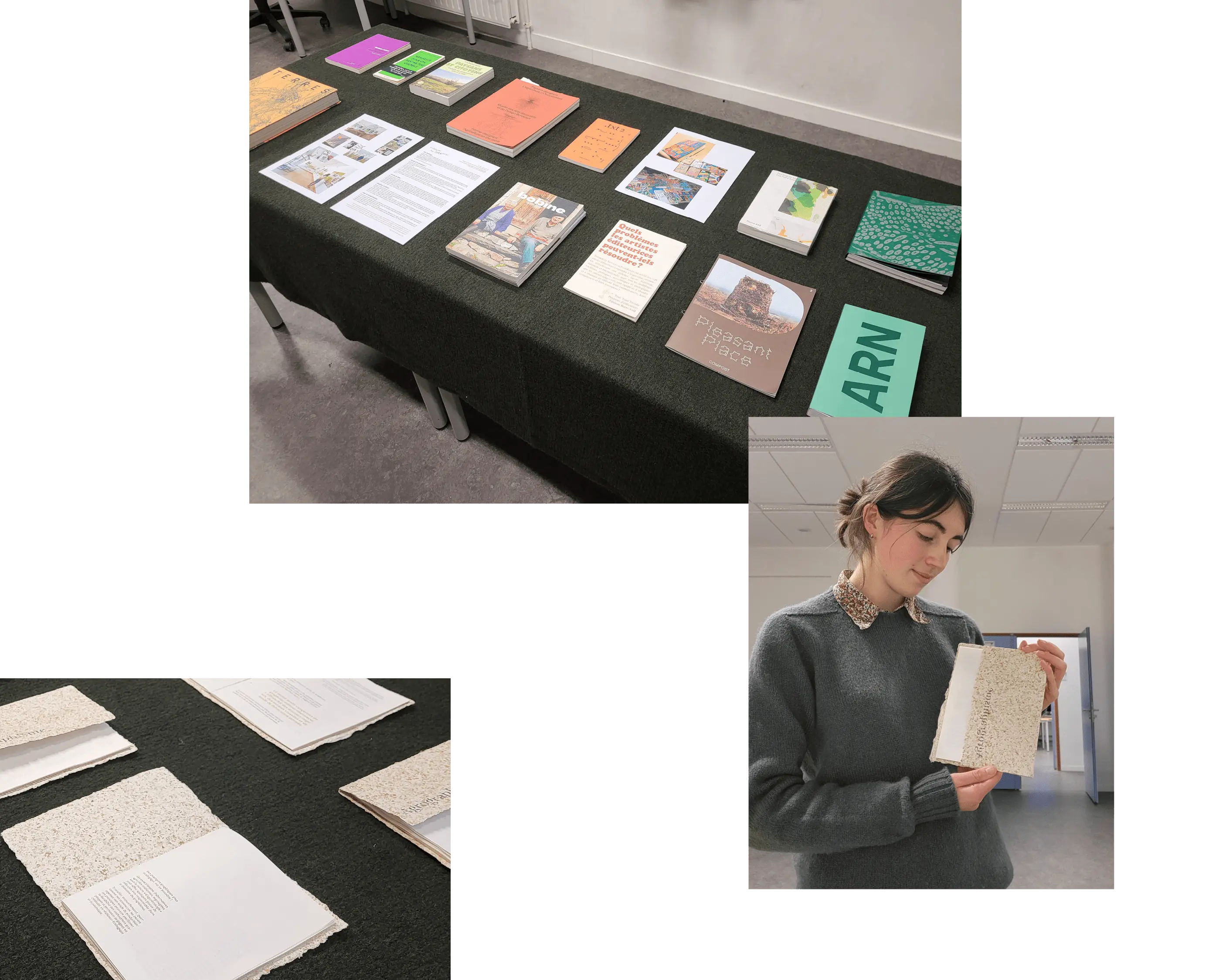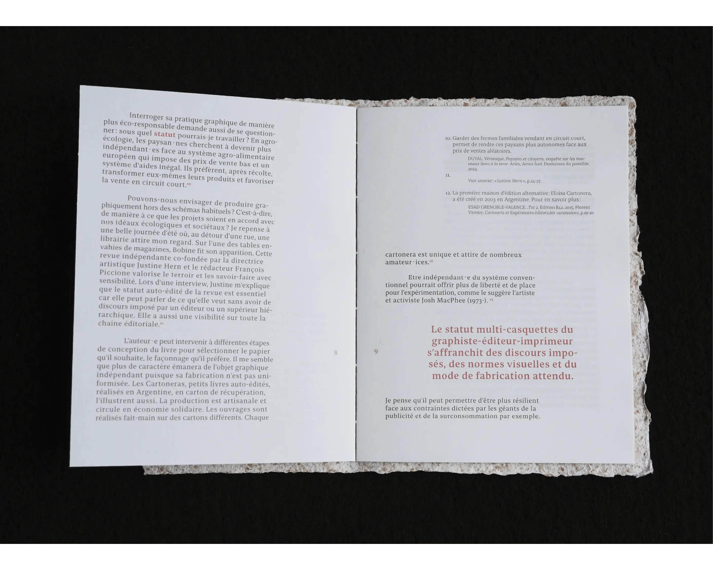 La couverture est réalisée à partir de son de blé, par l'artisan papetier Bruno Pasdeloup. L'ouvrage est assemblé en reliure suisse, révélant les coutures faites-main.