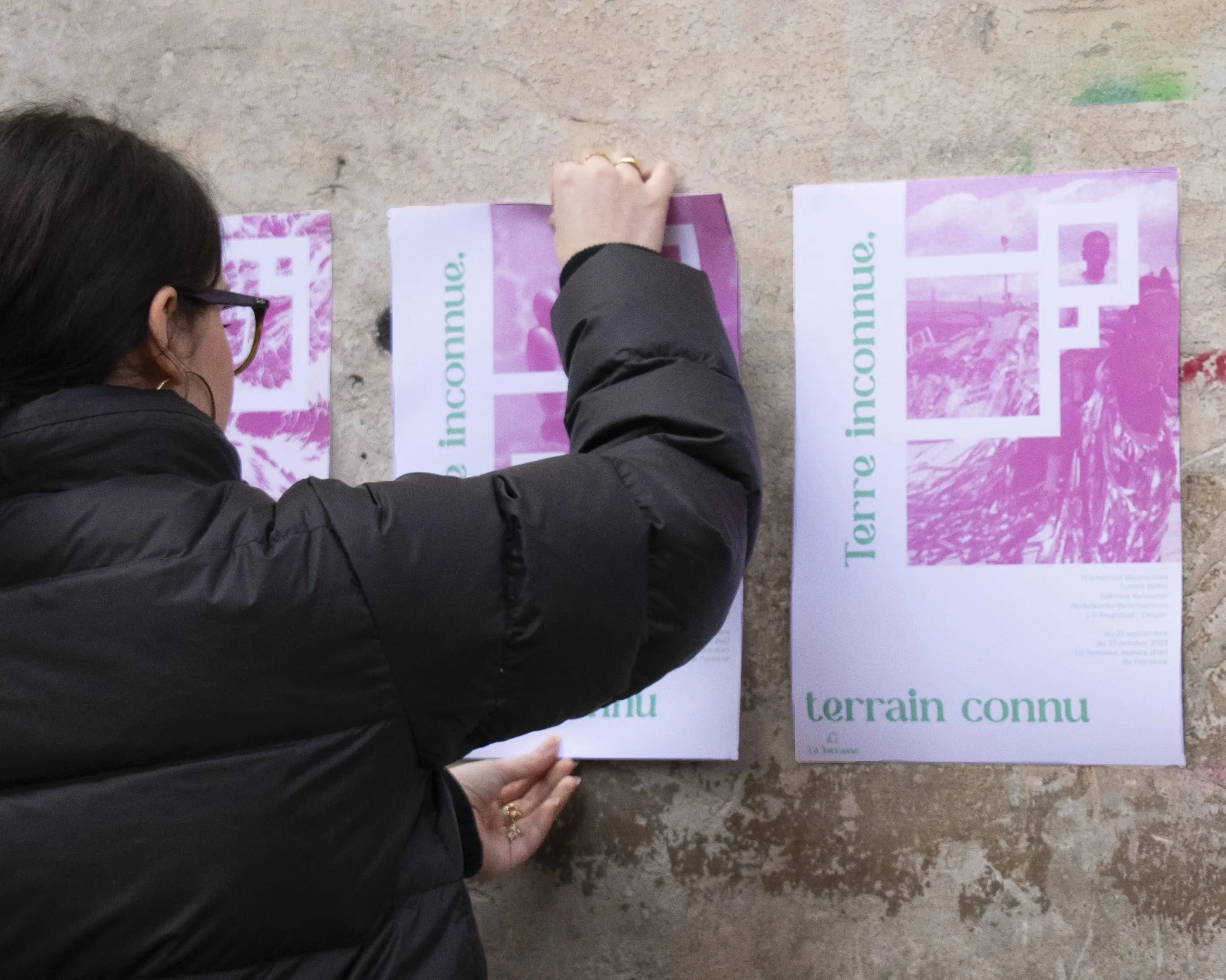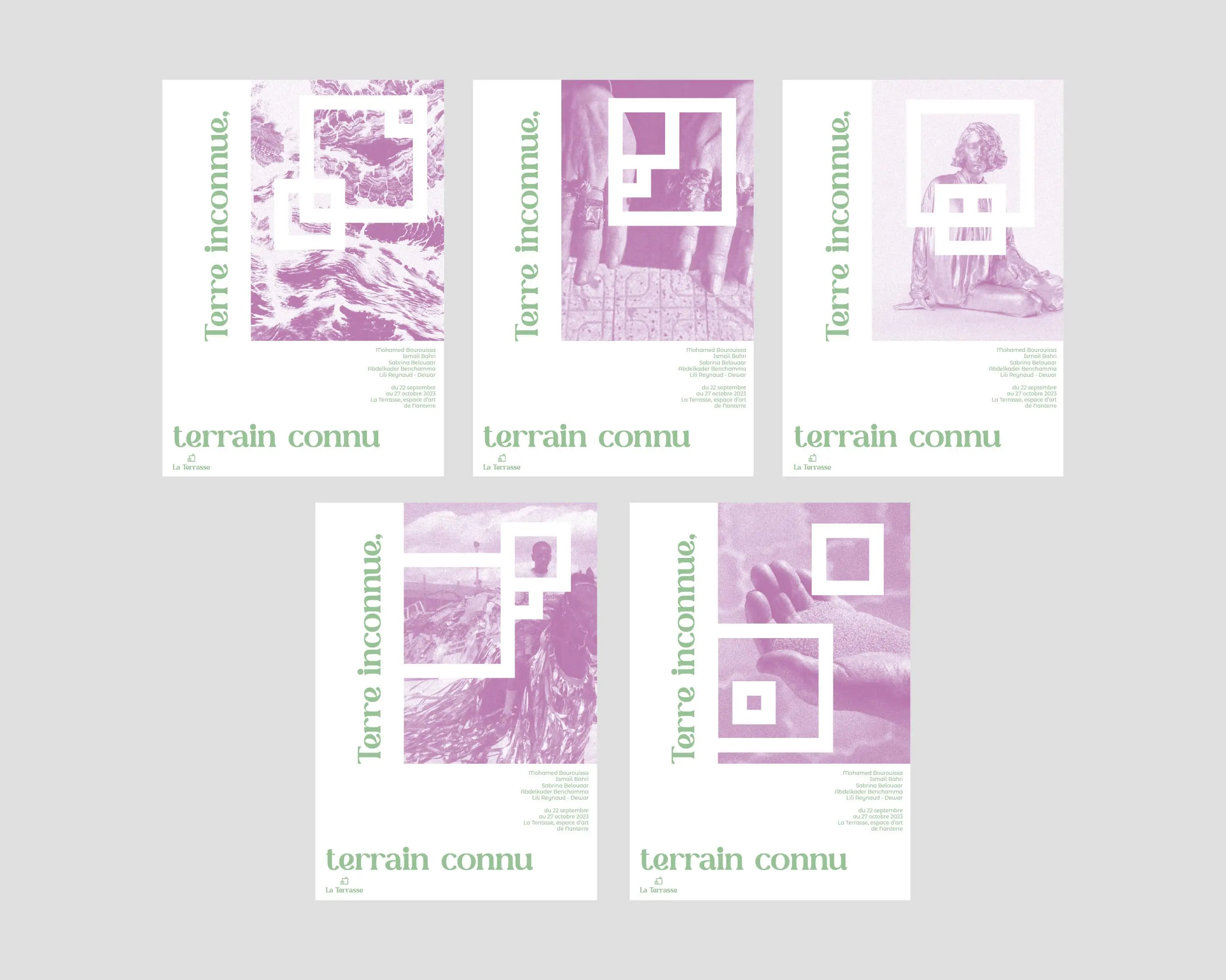 Les affiches de la galerie d'art La Terrasse sont reconnaissables par un traitement bichromique rose et vert.